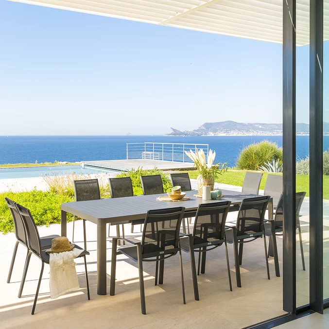 Pour gagner de la place, accordez la table de jardin extensible « Paradize » avec des fauteuils empilables Hespéride.
